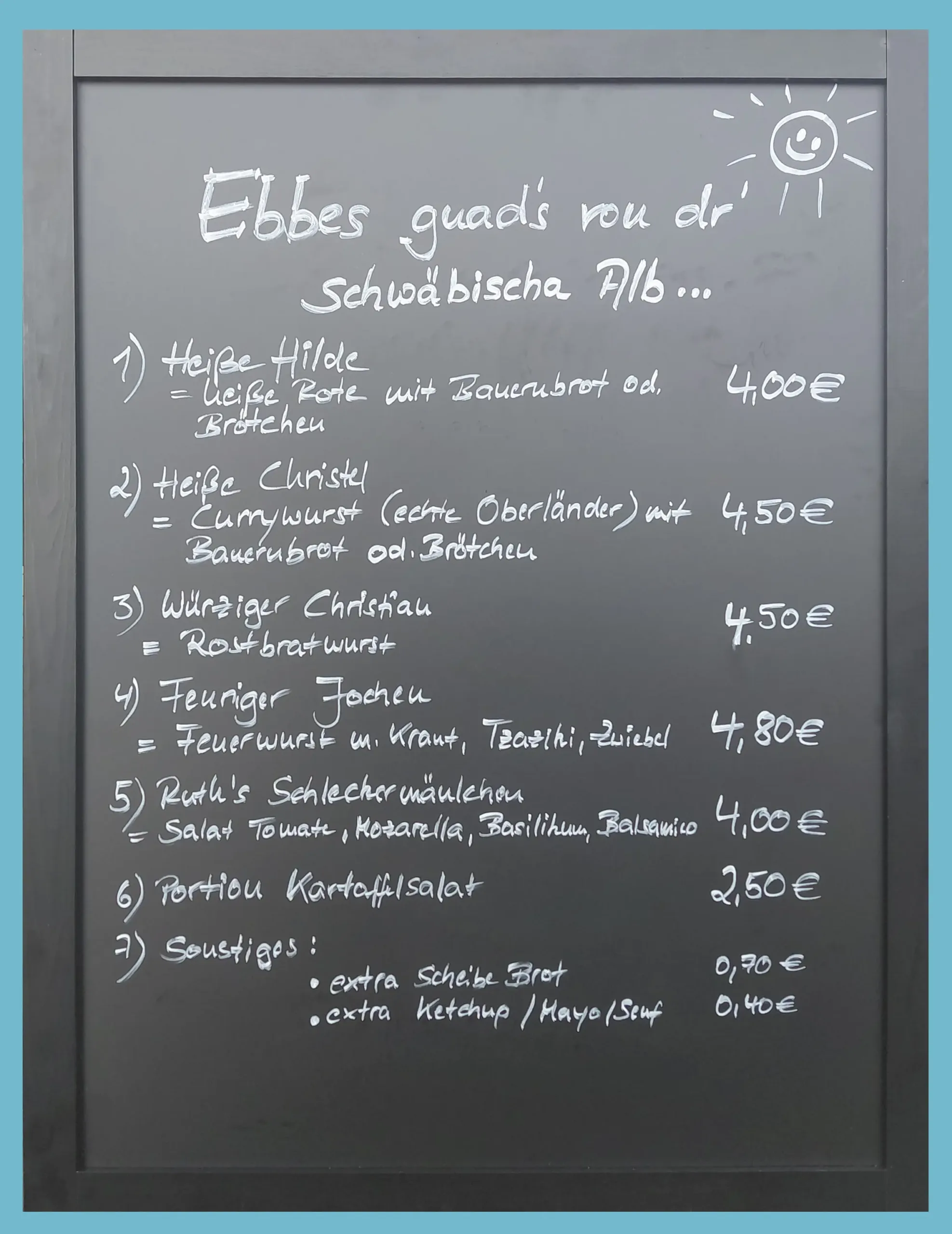Ihr seid herzlich eingeladen, mich am Fuße der schönen schwäbischen Alb zu besuchen, um Euch einen Eindruck über die kleine aber feine Speisenauswahl aus nachhaltigen und vor allem regionalen Wurst-Köstlichkeiten zu verschaffen. Dazu biete ich Euch Bauernbrot oder Brötchen und besondere Getränke an. Typisch deutsch und zurück zu den ursprünglichen Wurzeln meiner Eltern, die schon im Ländle sehr erfolgreich einen Feinkost-Laden geführt haben und mir schon als Kind gezeigt haben, dass qualitativ gutes Essen und ausgewählte Getränke gerne angenommen werden. Diese Tradition möchte ich gerne wieder aufleben lassen. Die lustigen Namen der Speisen sind daher nach meinen liebsten Menschen benannt. ❤️